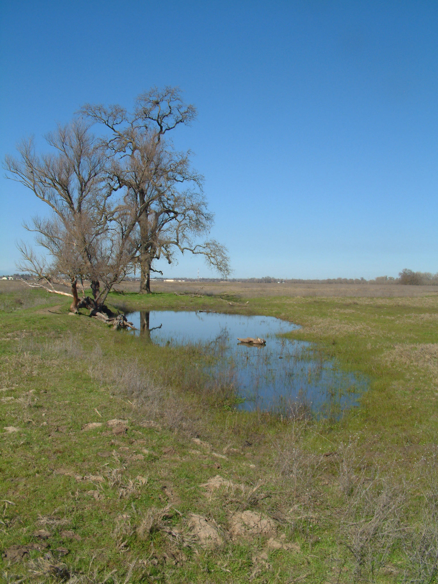 The 252-acre Dolan Ranch Conservation Bank is located near the Sacramento River at Colusa, California. The site was approved as a conservation bank in December of 1998 and features a wide variety of habitats including vernal pools, alkali meadows, annual grasslands, seasonal wetlands, and perennial marshes. Vernal pools provide important habitat for migratory waterfowl and shorebirds and, in the case of Dolan Ranch, support the vernal pool tadpole shrimp, a species listed as endangered under the U.S. Endangered Species Act. The grassland and alkali meadow habitats support other special-status species such as burrowing owl (Athene cunicularia), cackling Canada geese (Branta canadensis minima), and Swainson’s hawk (Buteo swainsonii); perennial marshes are potential habitat for the threatened giant garter snake (Thamnophis couchi gigas). The site also supports several rare plants.